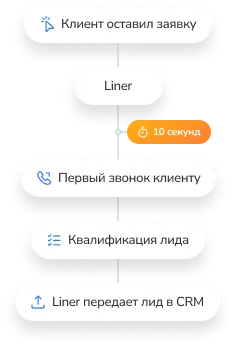 Если не связаться с клиентом в течение 5 минут, вероятность сделки падает в 8 раз. Лайнер отвечает за 10 секунд и не даёт лидам "остыть" — возвращая их в воронку через звонки, мессенджеры и соцсети.